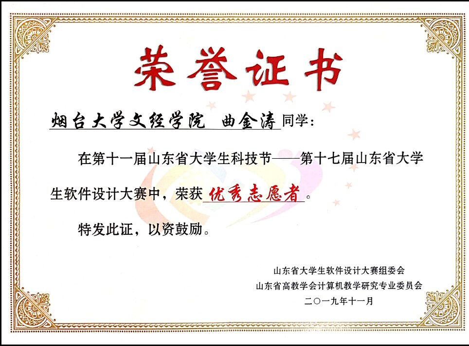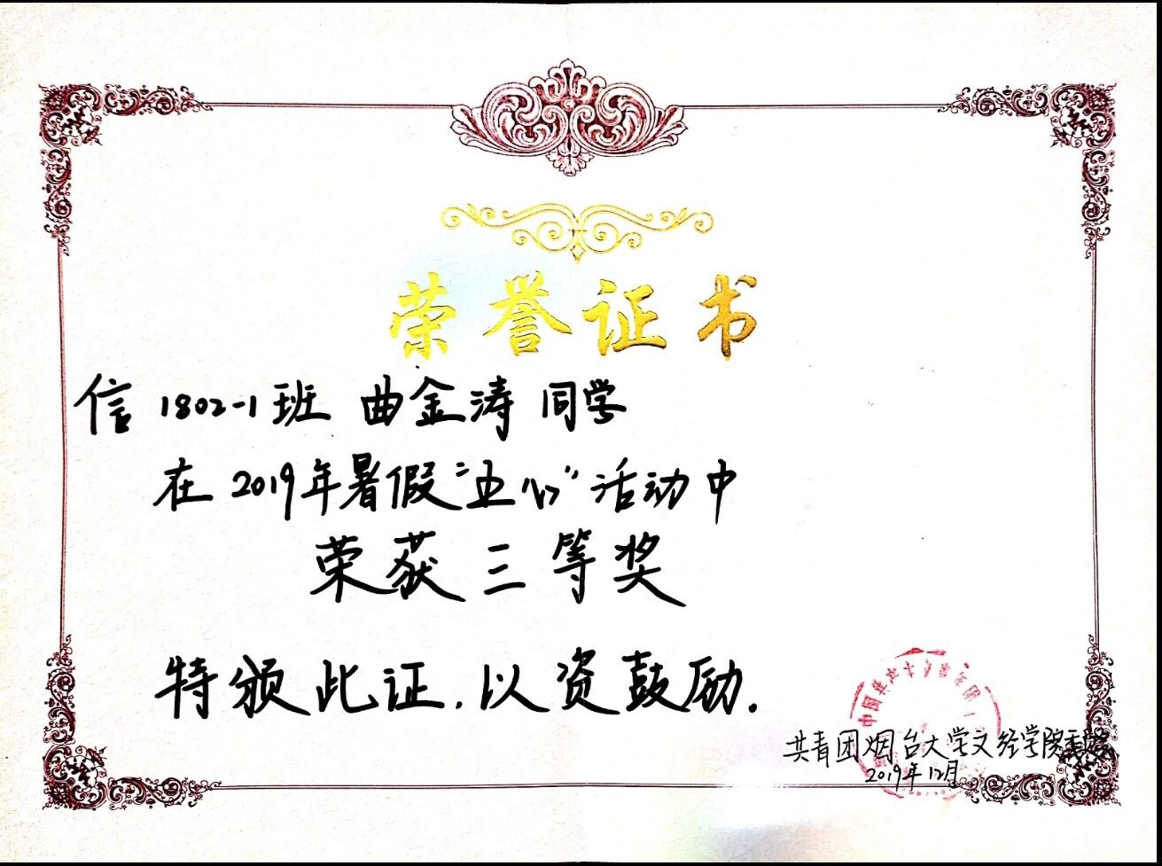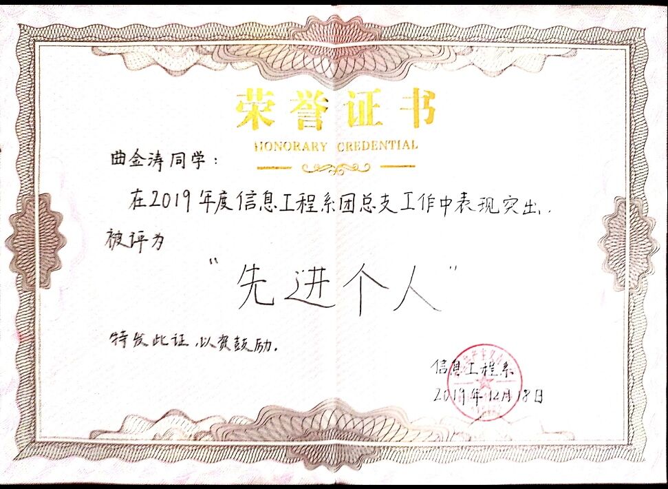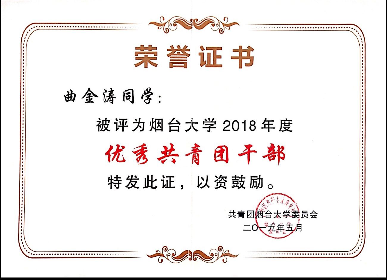 曲金涛,男,1999 年12月出生,团员,汉族,本科在读,我校信息工程系计算机科学与技术专业,现担任我校信息工程系团总支宣传部部长、信1802-1班团支部的组织委员。入校以来严格遵守学校的各项规章制度,做好模范带头作用。平日我妥善处理好班级工作以及和同学之间的关系,在各个方面取得了较大的进展。在学习上我比较系统的学习并掌握了较为扎实的专业知识获得国家级比赛奖项一项,省级比赛奖项四项,学校组织各类活动获奖十余项,连续三年获评烟台大学年度优秀共青团干部、“优秀学生干部”荣誉称号。在思想积极要求上进,不断提高政治素养,积极向党组织靠拢。积极组织及参加各类实践活动,在暑假期间赴临沂革命老区进行社会实践调研活动,获得校级优秀社会实践论文二等奖。疫情期间积极联系帮助当地学校,村委会进行疫情防控工作。获山东省大学生软件设计大赛三等奖、山东省大学生物理科技创新大赛一等奖、全国大学生数学建模竞赛山东赛区三等奖、烟台大学2020年度大学生“三下乡“社会实践优秀论文二等奖、烟台大学文经学院“优秀学生干部”荣誉称号等十余项奖项。
