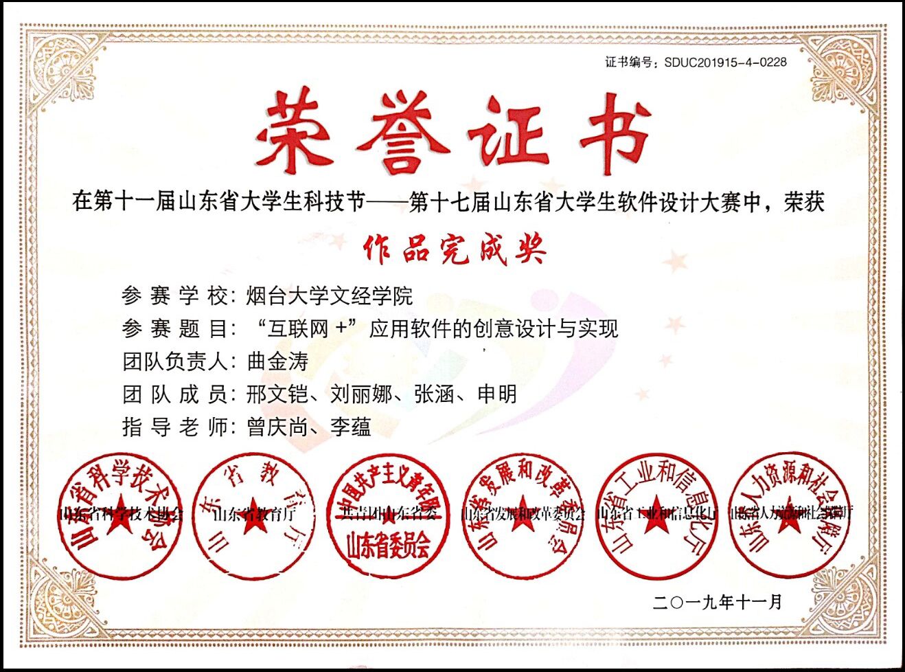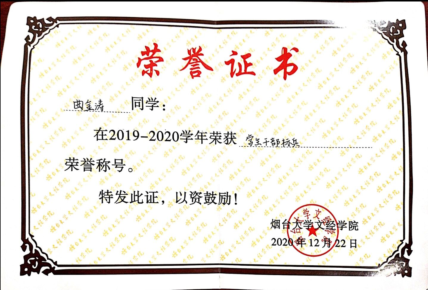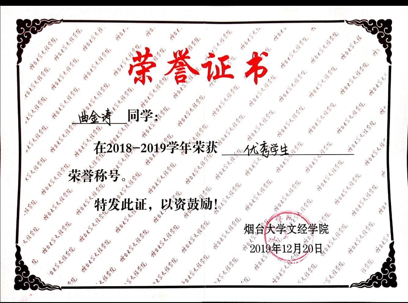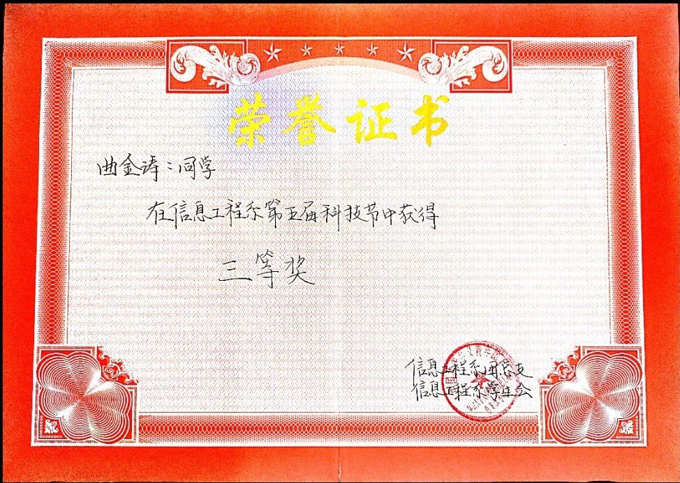 曲金涛,男,1999 年12月出生,团员,汉族,本科在读,我校信息工程系计算机科学与技术专业,现担任我校信息工程系团总支宣传部部长、信1802-1班团支部的组织委员。入校以来严格遵守学校的各项规章制度,做好模范带头作用。平日我妥善处理好班级工作以及和同学之间的关系,在各个方面取得了较大的进展。在学习上我比较系统的学习并掌握了较为扎实的专业知识获得国家级比赛奖项一项,省级比赛奖项四项,学校组织各类活动获奖十余项,连续三年获评烟台大学年度优秀共青团干部、“优秀学生干部”荣誉称号。在思想积极要求上进,不断提高政治素养,积极向党组织靠拢。积极组织及参加各类实践活动,在暑假期间赴临沂革命老区进行社会实践调研活动,获得校级优秀社会实践论文二等奖。疫情期间积极联系帮助当地学校,村委会进行疫情防控工作。获山东省大学生软件设计大赛三等奖、山东省大学生物理科技创新大赛一等奖、全国大学生数学建模竞赛山东赛区三等奖、烟台大学2020年度大学生“三下乡“社会实践优秀论文二等奖、烟台大学文经学院“优秀学生干部”荣誉称号等十余项奖项。