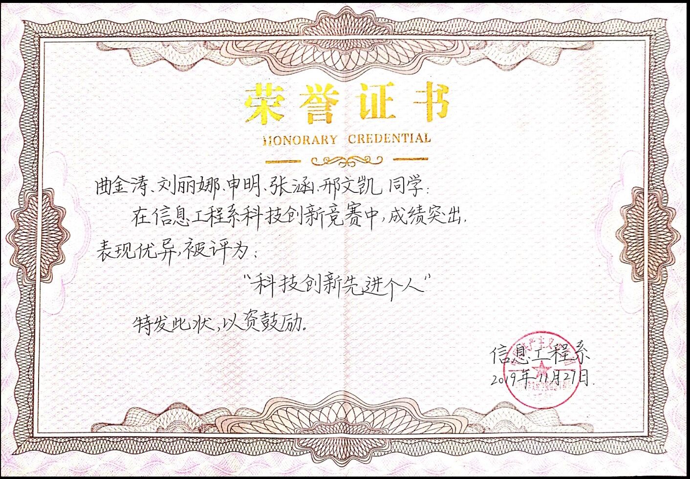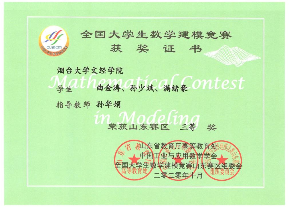 在学习方面,我牢记一名学生的最基本任务是学习,我始终把学习当作第一任务,从不敢松懈。我按时上课,不迟到,不早退,课上认真听讲,积极回答问题;课下认真完成老师布置的作业,复习老师课上所讲的内容。这些好习惯也使我得到了一定的回报,学习成绩一直在专业名列前茅。我积极参加各种竞赛比赛,也有着不小的收获。今年十月份,在全国大学生数学建模竞赛获得山东省赛区三等奖,在山东省大学生物理创新大赛获得一等奖,在山东省软件设计大赛获得三等奖。好的开始给了我足够的信心和勇气,除了课堂知识的学习,在课余时间,我经常去图书馆借阅图书,广泛地读书,从而丰富和充实自己。在2019年我获得了烟台大学文经学院信息工程系“科技创新先进个人”荣誉称号。如今,我更加明确自己的目标,也一直在为自己的目标付出行动和努力。所以,我也经常上网找资料学习各种专业技能,参加专业培训和实习,为就业做好充分的准备。