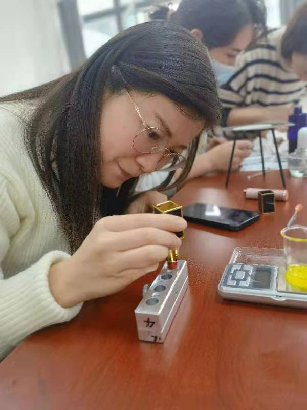 活动伊始,工会主席张爱娜老师分享了学习精油口红手作的初心,并向大家普及了精油的基础知识以及精油是如何影响人的身心,并让大家试着通过吸嗅的方式感受精油的魅力,老师们不时互动,现场气氛格外融洽。随后,张爱娜老师现场教授了制作天然有机口红的方法,她仔细认真地讲解并亲手示范,经过称量、研磨、加热、入模、出模等一步步的繁杂步骤,一支完美的口红逐渐成型。在张老师的指导下,老师们选定心仪的色号,认真仔细地制作着属于自己的口红。最后,老师们都将自己的得意之作展示出来,互相介绍自己口红的色号和所用到的精油并拍照留念。老师们受益匪浅,收获满满,在一片芬芳香气中愉快的度过本次活动。