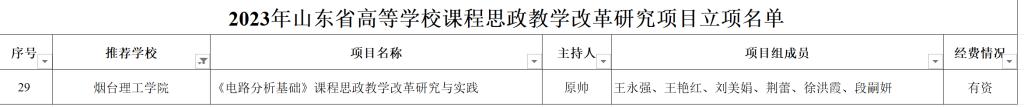 近日,山东省高等学校课程思政研究中心公布了2023年度山东省高等学校课程思政教学改革研究项目立项名单,我校新葡萄8883官网AMG原帅副教授主持的“《电路分析基础》课程思政教学改革研究与实践”课题获批有资立项,这是我校在省部级课程思政教学改革中的新突破,在同类院校中是唯一获批有资立项的高校。
