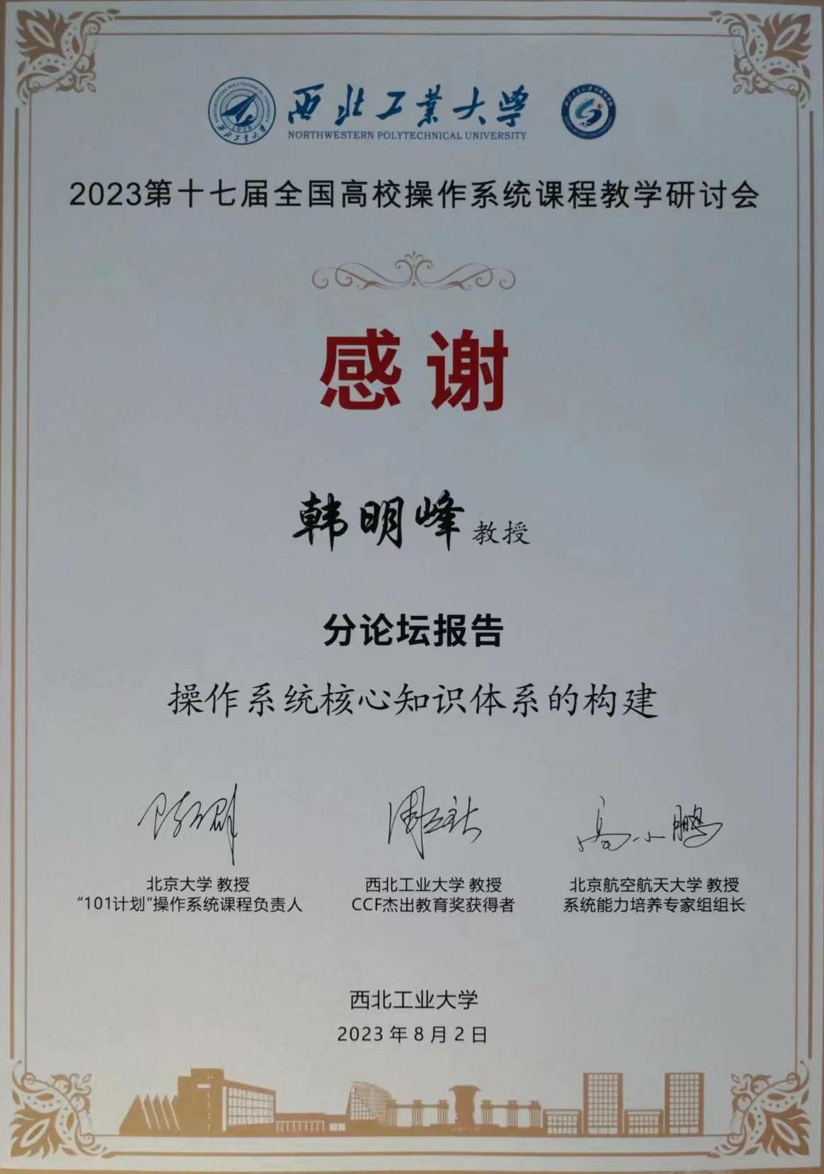 2023年8月2-3日,2023第17届全国高校操作系统课程教学研讨会在西北工业大学翱翔国际会议中心召开,西北工业大学计算机学院副院长、国家杰出青年基金获得者郭斌教授主持大会开幕式。我校新葡萄8883官网AMG韩明峰教授受邀在“101计划”操作系统课程建设分论坛上作“操作系统核心知识体系的构建”专题报告,他提出重视实验、实践不应以削弱OS教科书和OS理论学习为代价,两者相互仰仗,并以所构建的三个核心知识群为例,说明操作系统核心知识体系的构建重要且艰辛。“101计划”操作系统课程负责人、北京大学陈向群教授在分论坛点评中指出,韩老师所提的重视操作系统原理学习在当前形势下很重要,所构建的三个核心知识群更加精细深入,同时也受到其他很多与会专家的好评。