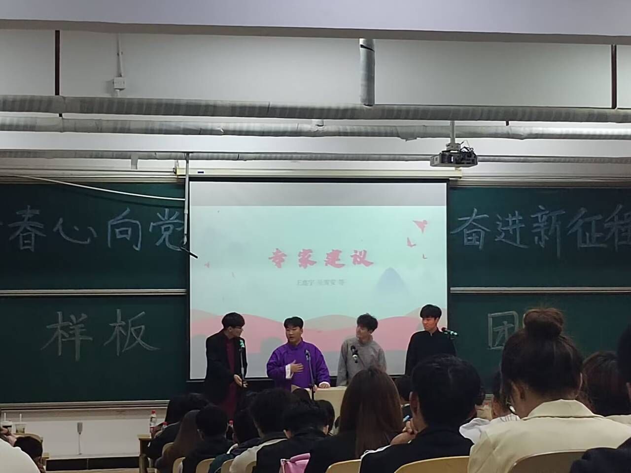 活动伊始,娓娓动听的歌曲《多远都要在一起》拉开本次活动的序幕。竹笛独奏《帕米尔的春天》激情悠扬的曲调描绘了帕米尔高原壮丽多姿的风光,领略了祖国的大好河山。紧接着,《青春心向党,奋斗新征程》和《青春向党》两个朗诵铿锵有力,表达了同学们对祖国的赞美,赢得了全场掌声,将现场气氛推向高潮。相声《专家建议》以及京剧《甘露寺》以传统与现代相结合的方式使同学们深刻领会到了传统文化的魅力。随后,歌曲《我的梦》、《没那么简单》以悠扬慷慨的腔调激励着同学们勇敢追寻自己的梦想。伴随着悠扬的歌声本次样板团日活动缓缓落下帷幕,正如歌名《我们都是追梦人》,希望我院学子勇敢追梦,一路向前。