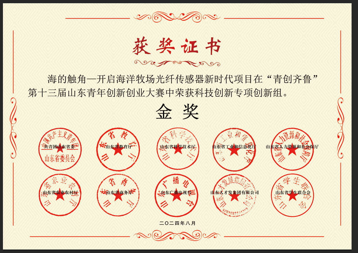 8月22日,“青创齐鲁”第十三届山东青年创新创业大赛在济宁市落下帷幕。在科技创新专项决赛中,我校推报的“海的触角——开启海洋牧场光纤传感器新时代”竞赛项目获得金奖,实现了近十年来驻烟高校在“青创齐鲁”山东青年创新创业大赛科技创新专项中零的突破!