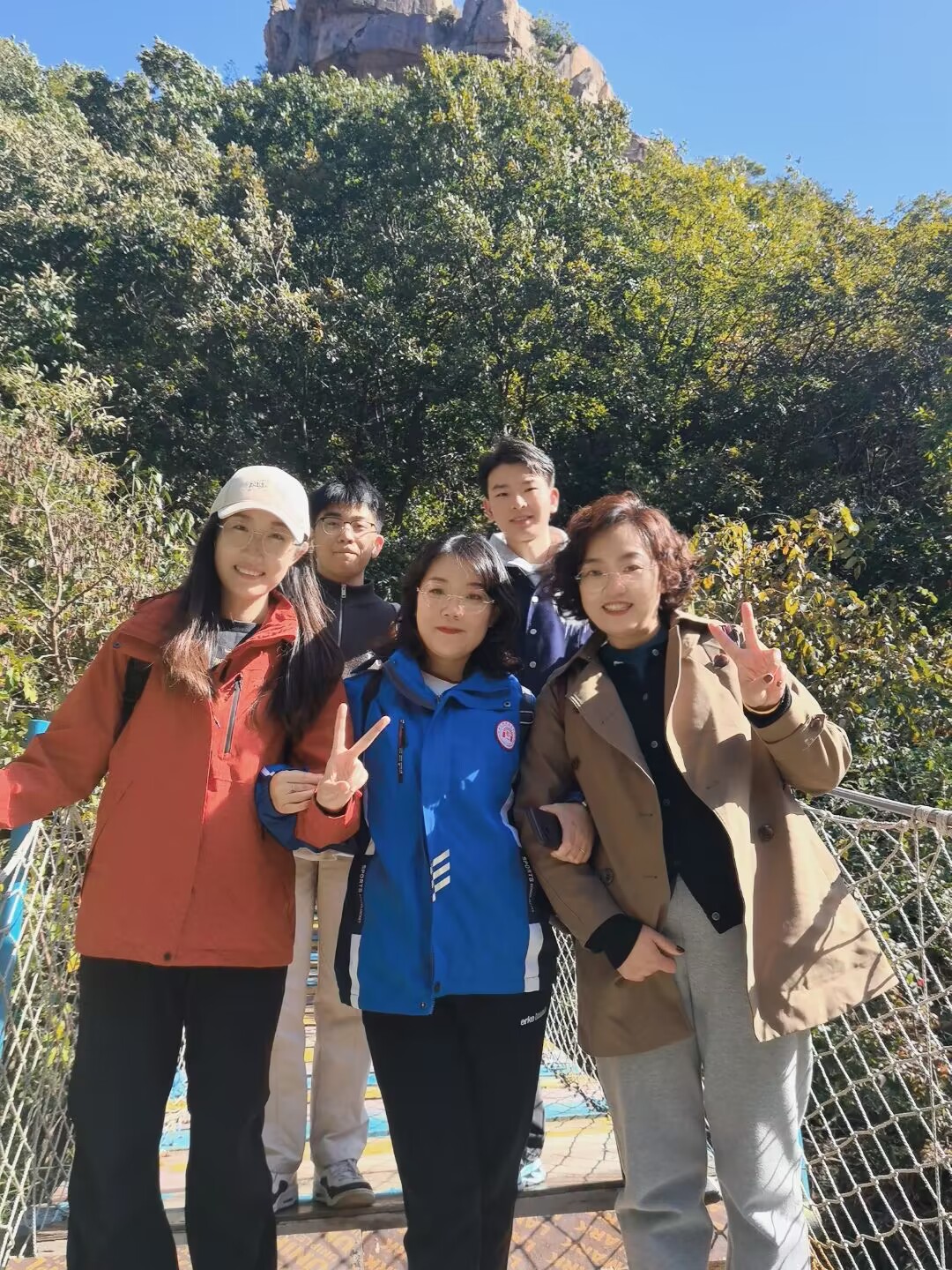 活动伊始,全体教职工乘坐大巴来到海阳招虎山,简单整备过后,团建活动正式开始。以“自然风光,琉璃世界”著称的招虎山,湖面水平如镜,清澈无瑕,沿路奇石林立,山情野趣尽在其中。教职工们拾级而上,欣赏着层峦重叠的招虎山美景。登山过程中,全体教职工热情高涨,兴致勃勃,大家或健步快走谈笑风生,或稳步途行合影留念,或你追我赶向上攀登。欢快的步伐是沿途的一道靓丽风景线,大家一路上相互帮扶,战胜了步步相连的阶梯,战胜了瞬间身体的疲劳,最终全体成员顺利登顶,从高处俯瞰群山,尽情享受着登山的乐趣。