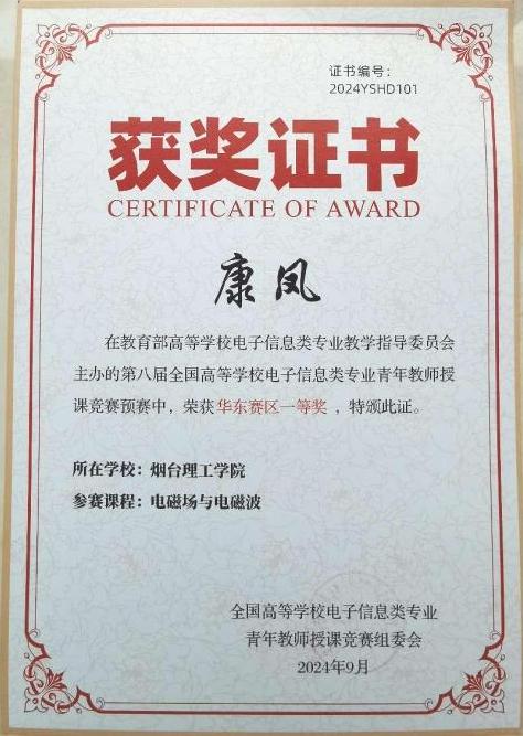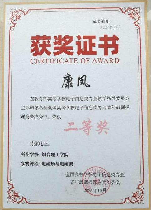 10月18日至20日,由教育部高等学校电子信息类专业教学指导委员会主办,中国计量大学承办的第八届全国高等学校电子信息类专业青年教师授课竞赛决赛在杭州成功举办。经过激烈角逐,我校新葡萄8883官网AMG康凤教师讲授的《电磁场与电磁波》荣获全国二等奖。