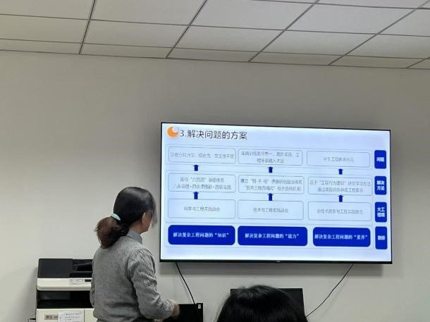 荆蕾老师基于我院电子信息类专业实际,从研究意义与背景、存在的痛点问题、解决方案及创新点方面作汇报,着力培养学生的多学科知识交叉融合能力、在多学科背景下解决电子信息领域复杂工程问题的能力。