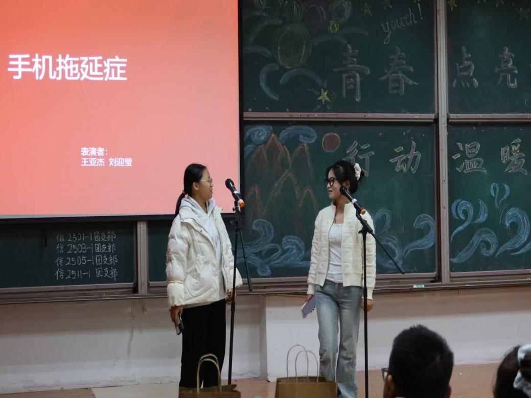 活动在合唱《起风了》的轻快旋律中拉开帷幕,蓬勃的歌声瞬间点燃现场氛围。紧接着,独舞《光亮》里,舞者似寒冬里跃动的暖光传递着向上的力量。独唱《萤火星球》以温柔声线诠释“微小光芒亦能汇聚温暖”的主题。随后,相声《手机拖延症》则用幽默表演引发学子对“高效服务社区”的思考。互动环节“红歌猜猜猜”将氛围推向高潮,同学们踊跃抢答,在熟悉的红色旋律中重温奉献精神,笑声与歌声交织成冬日里的暖流。朗诵《以青春之名 暖社区之冬》以铿锵语调诉说青年服务社区的信念,合唱《我相信》《日不落》以集体之声传递“以行动暖寒冬”的决心。最后,独舞《恰恰组合》的灵动与陶笛合唱《相亲相爱》的温情,为整场活动画上了圆满的句号。