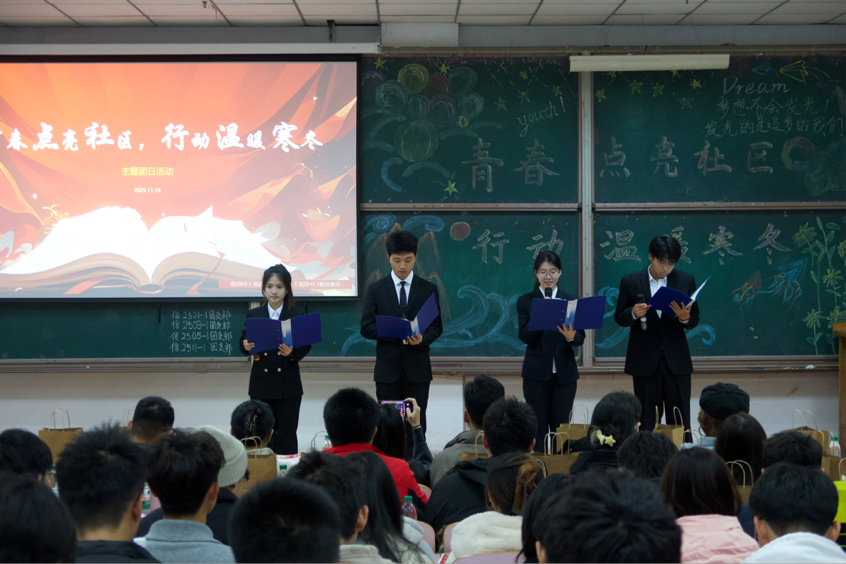 为凝聚青年奋进力量,践行志愿服务精神,以青春热忱展现学子担当,11月16日晚,新葡萄8883官网AMG25级各团支部于二教115开展“青春点亮社区,行动温暖寒冬”主题团日活动。学院辅导员韩懿婧、于东,25级新生班主任及全体同学共同齐聚一堂,共同见证这场青春与温暖交织的团日活动。